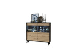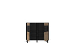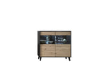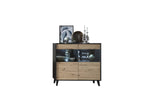 This modern and beautifully crafted sideboard cabinet features two partially-glazed hinged doors and a combination of open and closed compartments. It is finished in a graceful combination of oak and black matt, blending in seamlessly with any home decor. Use it anywhere in the house to display decorations or organize book collections, from the bedroom to the living room.