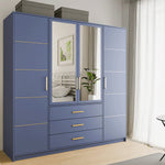 The Bali D4 blue wardrobe is both elegant and practical, featuring four hinged doors, two of which are mirrored to enhance your room’s light and space. Made from durable 16mm laminated chipboard, this wardrobe is built to last and is easy to maintain. The gold handles add a touch of luxury and sophistication, elevating the wardrobe's overall aesthetic. Perfect for any bedroom, the Bali D4 offers a stylish storage solution with a modern design.
