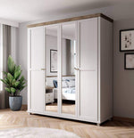 Bring style and elegance to your bedroom with this mirrored wardrobe. Available in two colours, Oak Lefkas with either dark green or white, it will fit in any modern or contemporary decor. The wardrobe is made from 16mm laminated board, and offers four doors, five shelves and one hanging rail for storage space.
