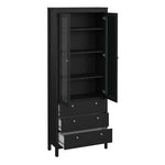 A contemporary glass display cabinet with two doors and three drawers in an elegant design complete with a simple metal handle, also available in white