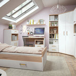 This neutral and functional kids collection is perfect for all age groups, finished in light oak and stunning white high gloss. Nice compact small 1 drawer bedside with open shelf for magazines.